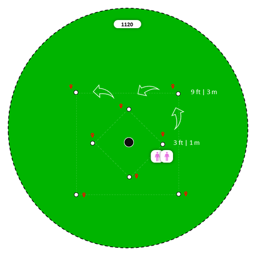 Players [1v1] stop the ball past the hole and short of an alignment stick. First to 5 points wins.