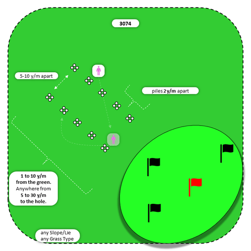 How to practice? For the bucket of 40 balls, make 5 piles of 4 balls per one perpendicular line; 2 lines of 5 piles; lines [5-10 y/m apart], piles [2 y/m apart]. Setup on any grass, any slope, anywhere from 1 to 10 y/m to the green and 5 to 30 y/m from the hole. Hit 2-4 bump’n’run shots alternately from pile to pile. In the process, hit to different flags (targets) and count the number of successful shots (success=inside [10 ft | 3 m]).