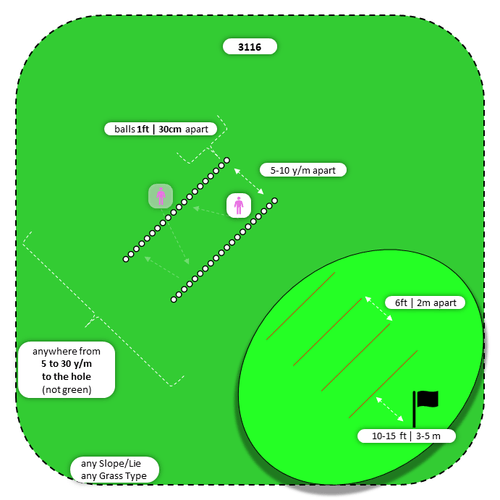 How to practice? For the bucket of 40 balls, make 2 parallel ball lines of 20 balls per line; lines [5-10 y/m apart], balls [1ft | 30cm apart]. Setup on any grass, any slope, anywhere between 5 y/m and 30 y/m from the hole (not the green). On the green, use alignment sticks, clubs, or string lines to form 3 landing zones [6 ft | 2 m] apart. Hit 3-5 chip shots in a row to the same landing zone, then jump to the other ball line and hit 3-5 shots to a different landing zone. Count the number of successful lands.