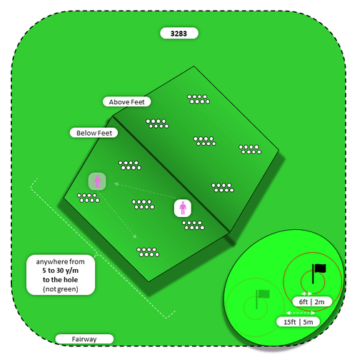 How to practice? Depending on the length of the slope, make at least 2 piles of 20 golf balls (at most 5 piles of 8 balls) above feet level extending between 5 y/m and 30 y/m from the hole (not green). Depending on the number of piles, hit 2-5 balls alternately from pile to pile. Repeat the activity from the opposite slope (i.e. below feet).