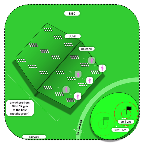 How to practice? Make at least 2 piles of 20 golf balls (at most a line of 5 piles of 8 balls) per player, up to 5 players. Piles of balls must be extending at an uphill slope between 30 y/m and 60 y/m from the hole (not the green). Each player occupies one pile of balls, all players hit from the same distance. After all the balls from the players' pile are hit, players move together to the next line of piles. Once players have hit all the balls, make the same setup at the opposite slope (i.e. downhill).