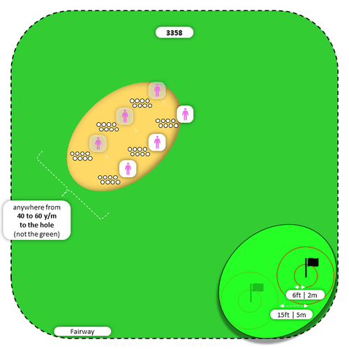 How to practice? Make 2 piles of 20 golf balls per player, up to 5 players. Two piles must be 5 y/m apart and distanced at 40 – 60 y/m from the hole (not the green). Each player occupies one pile of balls, all players hit from the same distance. After all the balls from one pile are hit, players move together to the second line of piles. Hit two buckets in total.