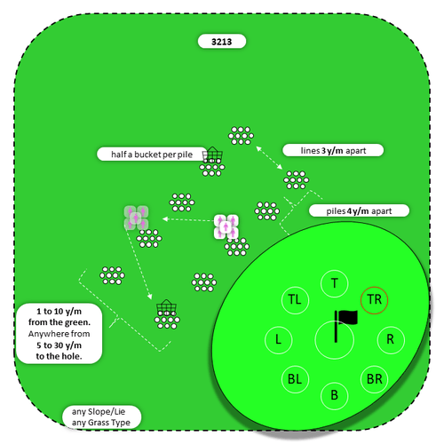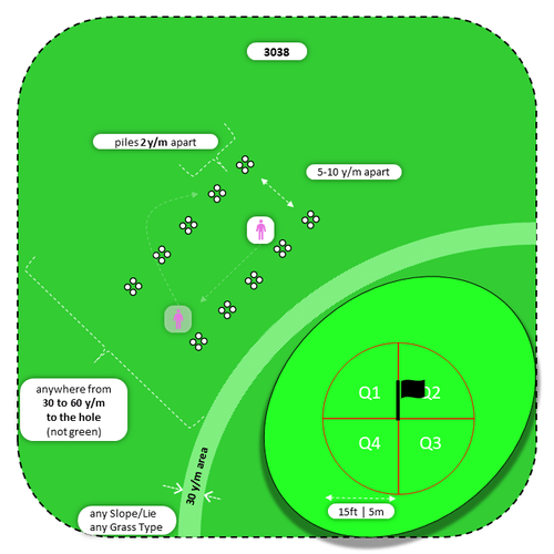 Perpendicular Piles Matrix is made for players who are already skilled in accuracy, who know how to aim, and need distance control skills. You will move from pile of balls to the pile of balls perpendicularly to the green, thus focusing on distance control and technique.