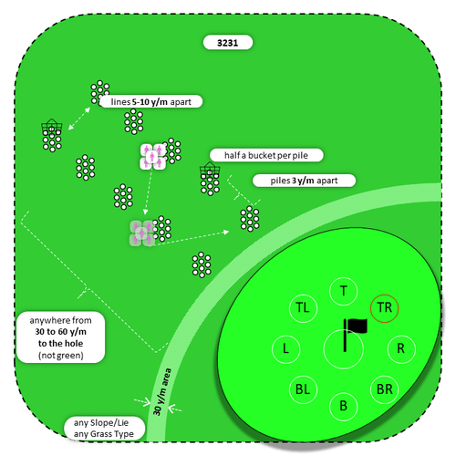 This Matrix is a great choice for players who are comfortable in a chaotic environment, prone to taking risks and tend to pull off miracle shots on the course. You will find a plenty of dynamic movement around the green and a complete absence of stationary exercises. You will move from pile to pile in an arbitrary fashion, and hit every other shot from a different distance and a different angle. It is made for players in need of ball control skills.