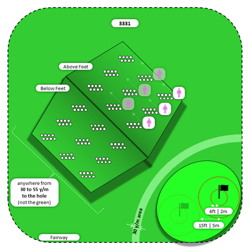 Scatter a bucket of balls (avg. bucket is 40 balls) next to the green. Scatter into 8 equal piles of 5 balls and stop bump’n’run shots inside Bullseye. Count the number of balls in the inner and outer Bullseye.