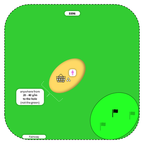 Hit – flop shot – two buckets of balls (avg. bucket is 40 balls) from the sloped fairway; one bucket from the uphill slope and one bucket from the downhill slope.